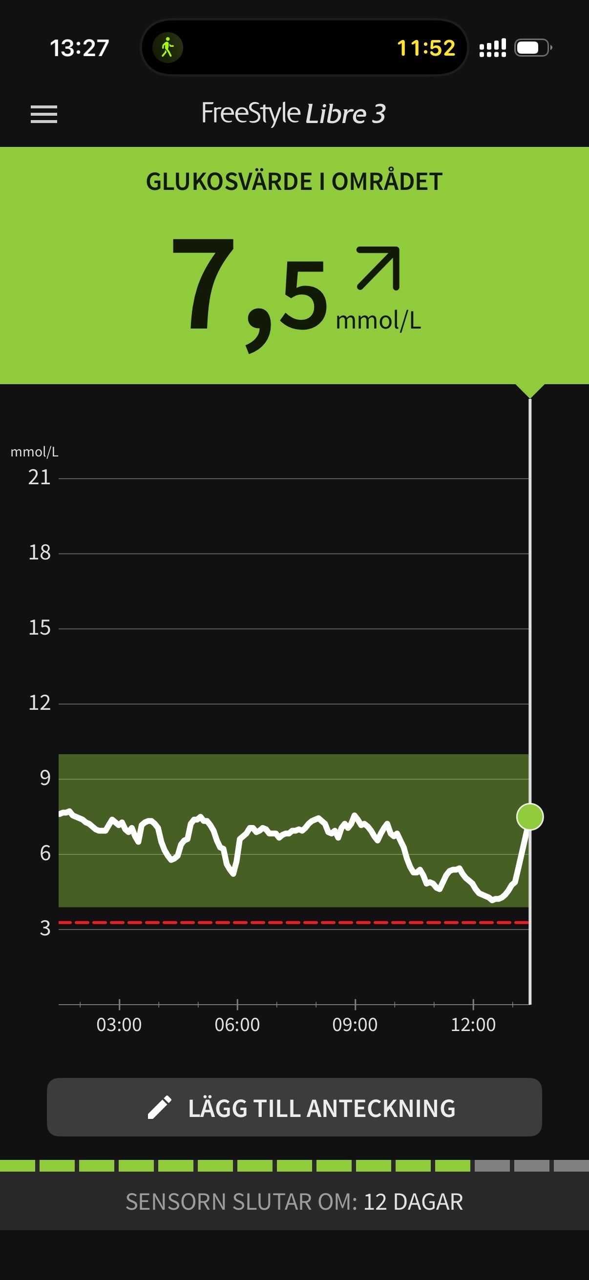 FRÅN NATHALIES SENSOR Efter en rejäl lunch började blodsockret stiga. En lugn promenad i cirka 15 minuter räckte för att kurvan skulle vika ner snabbt och stabiliseras igen. Små val. Direkt feedback.
